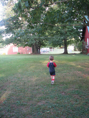 Here is Jake headed to Granny's house. I thought this was cute because when I was his age I was making this trek the opposite direction... from Granny's house (my Mom and Dad's) to Nanny's house on the hill where we live now. I wore out the grass going back and forth and my Grandad used to tell me he was going to build me a tunnel so I wouldn't have to get wet when it rained and cold when it snowed. Of course I believed him! ;)